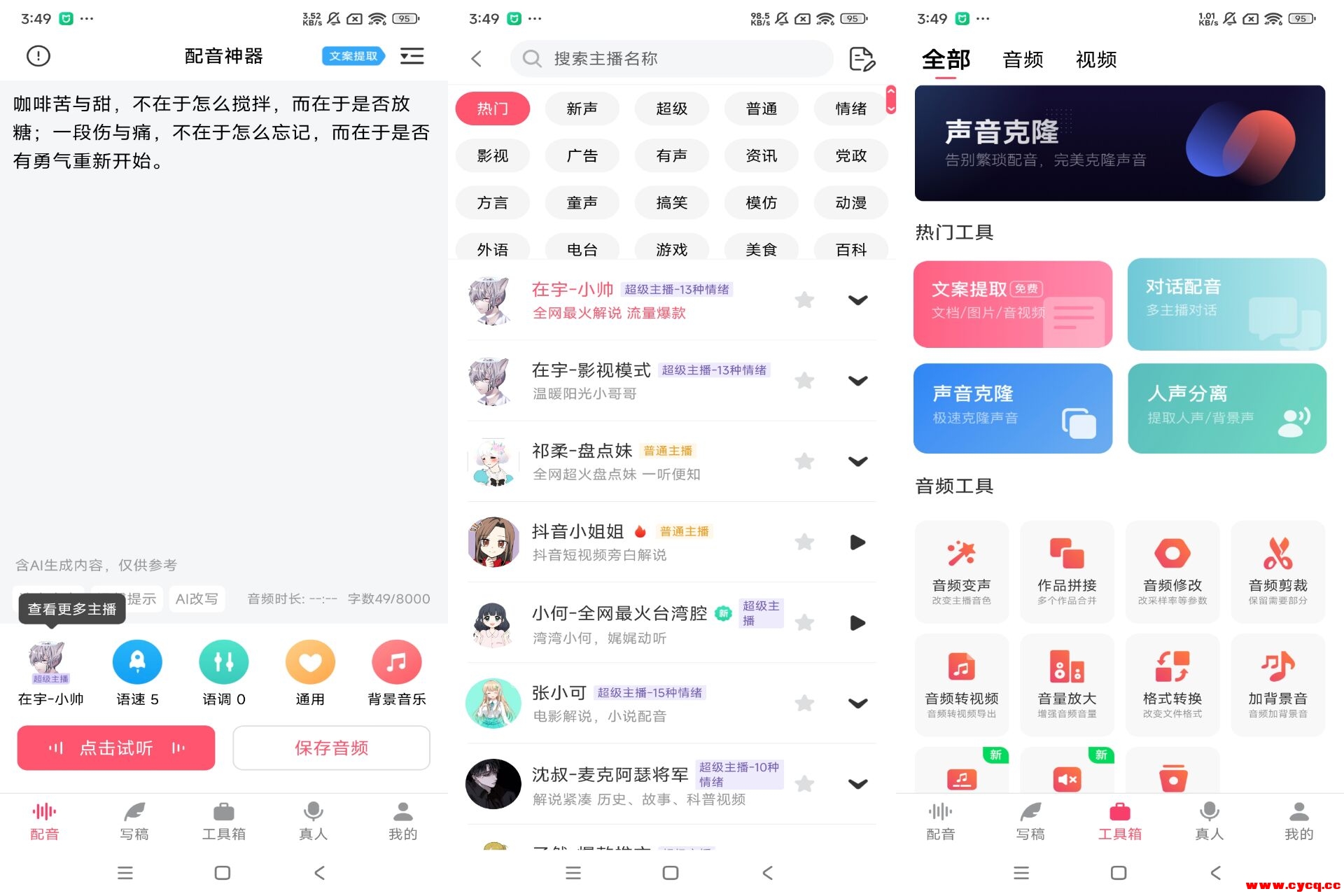 【软件名称】:配音神器 【软件版本】:2.2.24 【软件大小】:56.66M 【软件介绍】:一款手机配音神App,声音魔法,创作无限!提供文字转语音、语音合成、配音创作等功能,让你轻松将文字转换成生动流畅的语音,为视频、动画、广告等创作配音。界面简洁,操作便捷,是你的配音创作者好帮手! 【下载地址】:**** 本内容被作者隐藏 ****